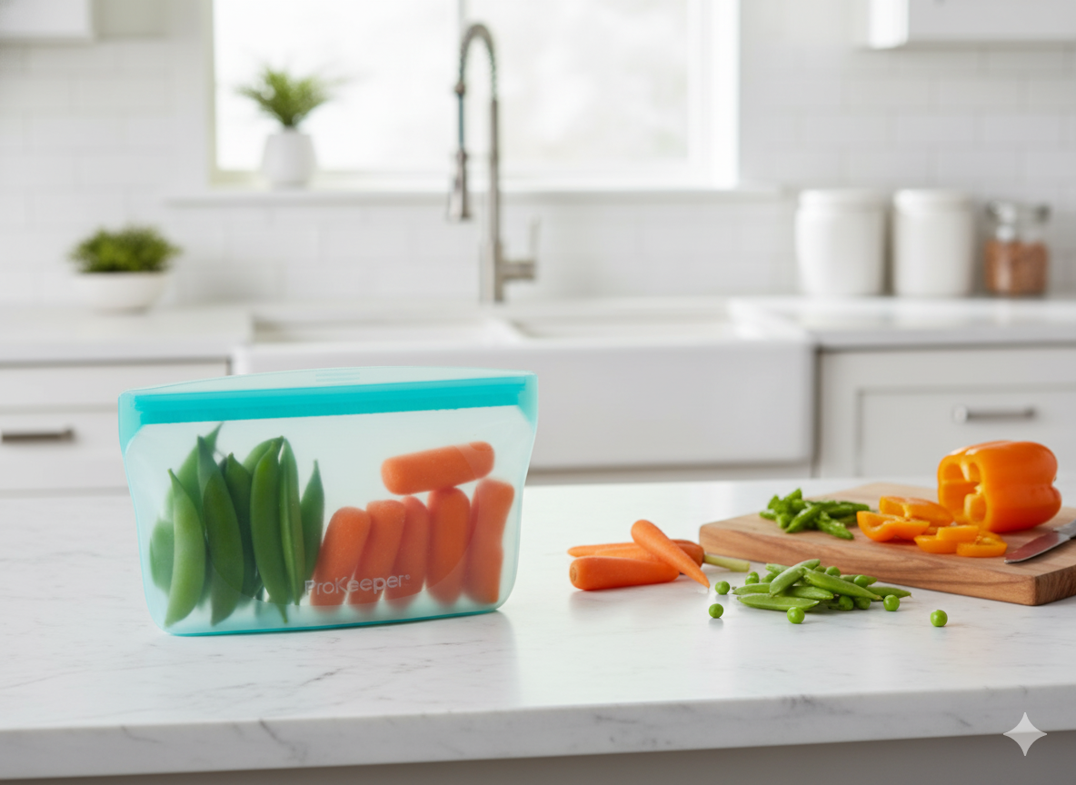 Bolsa reutilizable tipo ziploc ideal para guardar frutas, verduras y más, cuidando el medio ambiente.