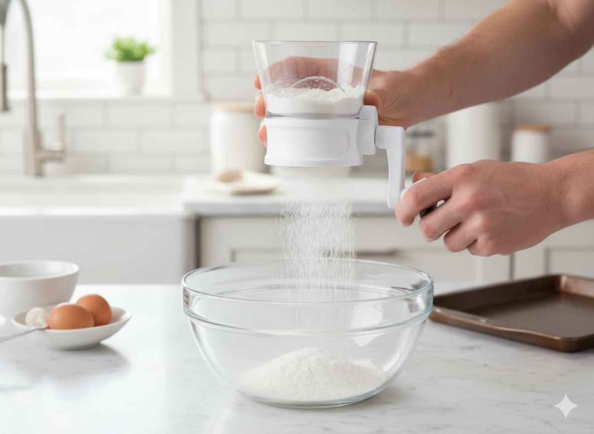 Herramienta práctica para tamizar harina, airearla y mezclarla mejor en tus recetas, ideal para repostería y cocina diaria.