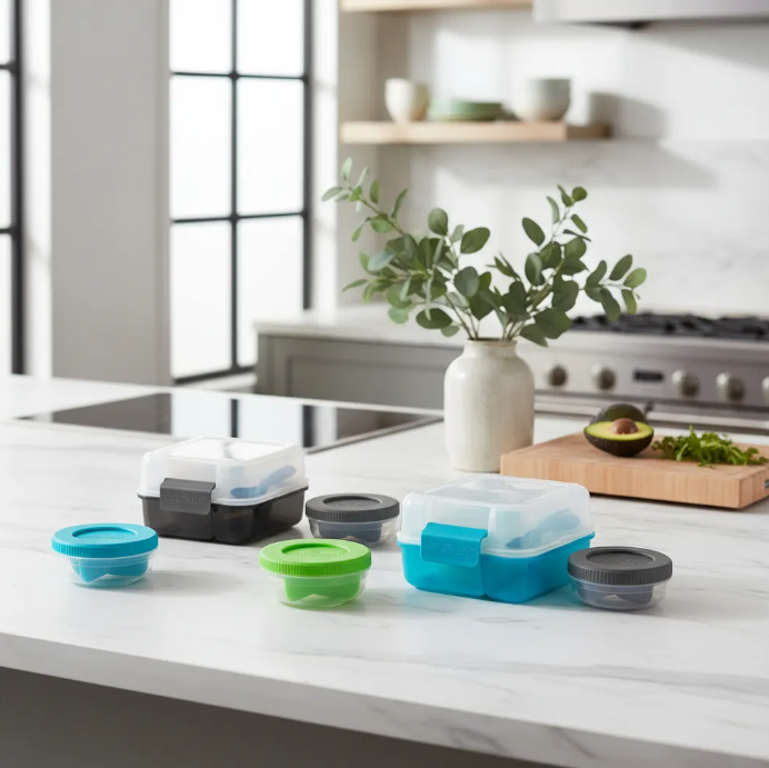Disfruta de una variedad de opciones para tus comidas con este juego tipo bento de 14 piezas, perfecto para llevar comida al trabajo, viajes o cualquier lugar. Incluye recipientes para sándwiches de varios niveles y contenedores apilables de 5 onzas con divisor extraíble de 3 secciones.