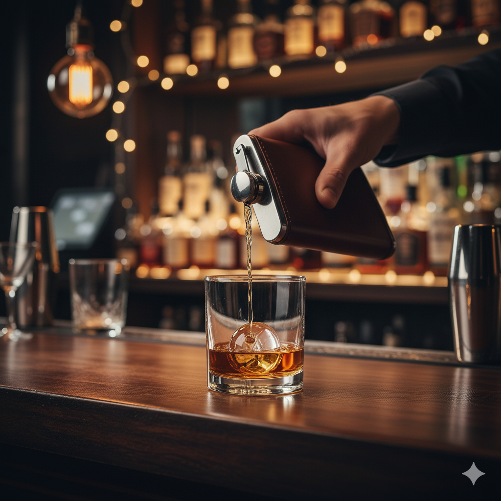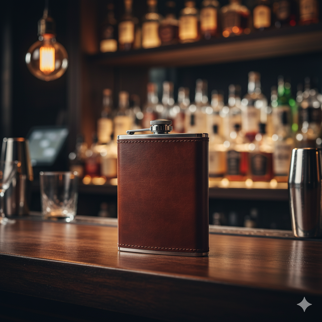 Disfruta de tu bebida favorita donde quieras con nuestra elegante licorera de piel marrón. Su diseño extraplano y sofisticado la convierte en el accesorio perfecto para llevar discretamente tus destilados favoritos.