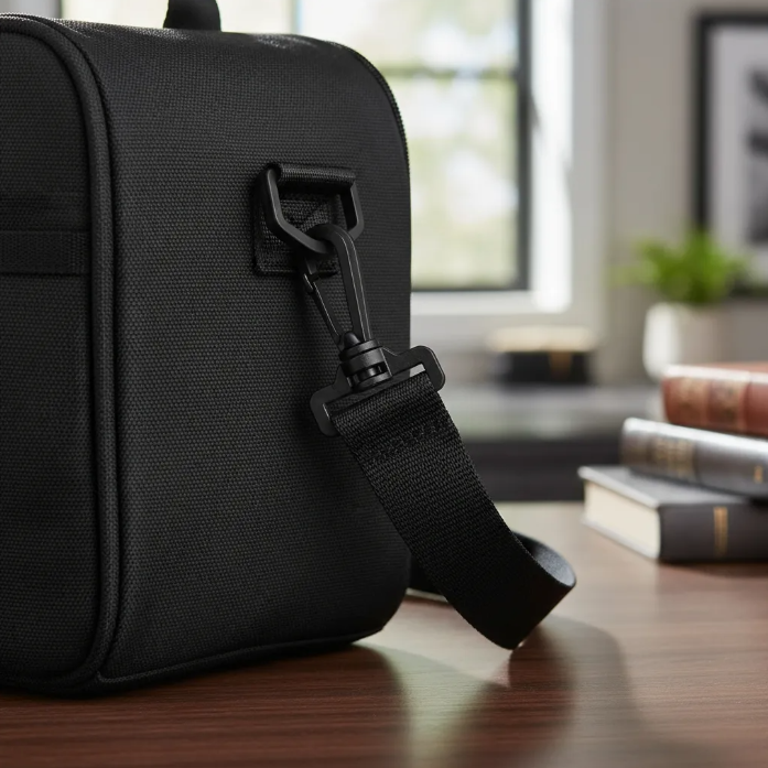 Bolsa portalimentos con cremallera doble, asa de mano con refuerzo y bandolera regulable y extraible.