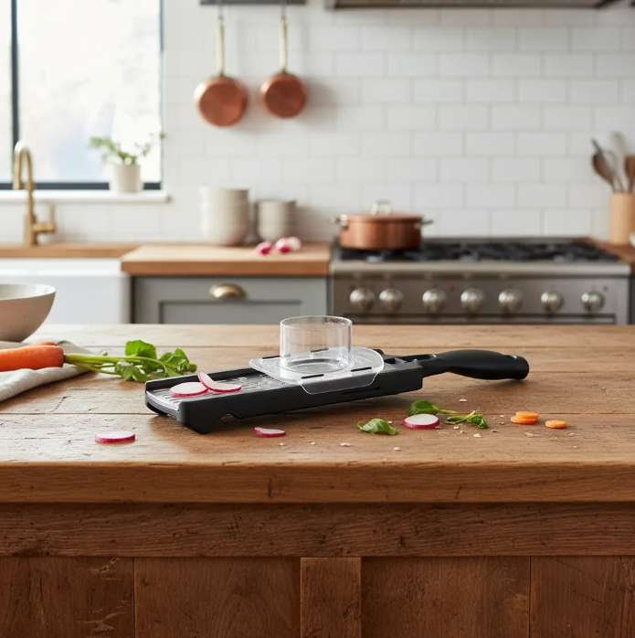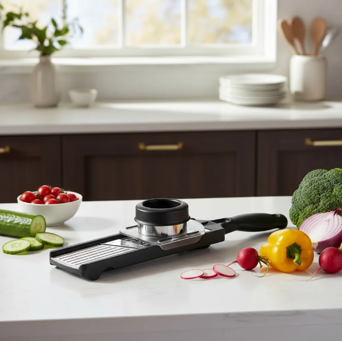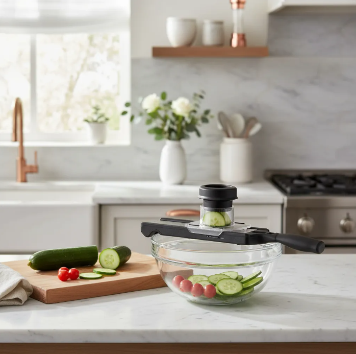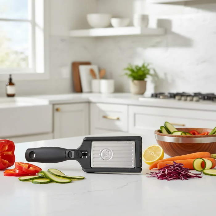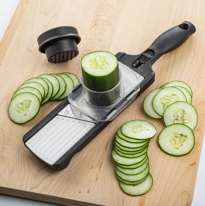 Mandolina chica de mano PL8 de Progressive la mandolina de mano corta perfectamente los dientes de ajo, rábanos, zanahorias, pepinos y más verduras. El protector para manos integrado sostiene la comida de forma segura y protege los dedos. Evitar cortaduras. El mango de agarre suave y las patas antideslizantes se sientan de forma segura sobre un tazón o tabla de cortar.